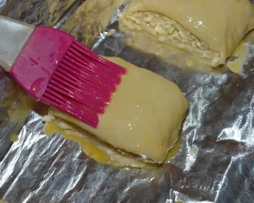 - Выложите заготовки на противень, застеленный пергаментом. Смазывайте верх плацинды небольшим количеством молока или яйца для ровного золотистого цвета.