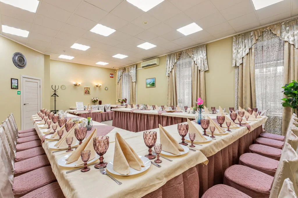 Пространство трапезной подбирают с учётом числа гостей и требований к порядку. Столы располагают вдоль стен, чтобы создать эмоционально спокойную зону для разговоров и воспоминаний. Важны хорошая вентиляция, чистота и доступность санузлов. Фасады столов могут украшать нейтральные свечи и памятные фотографии, но без излишнего милитаризма или помпезности.
